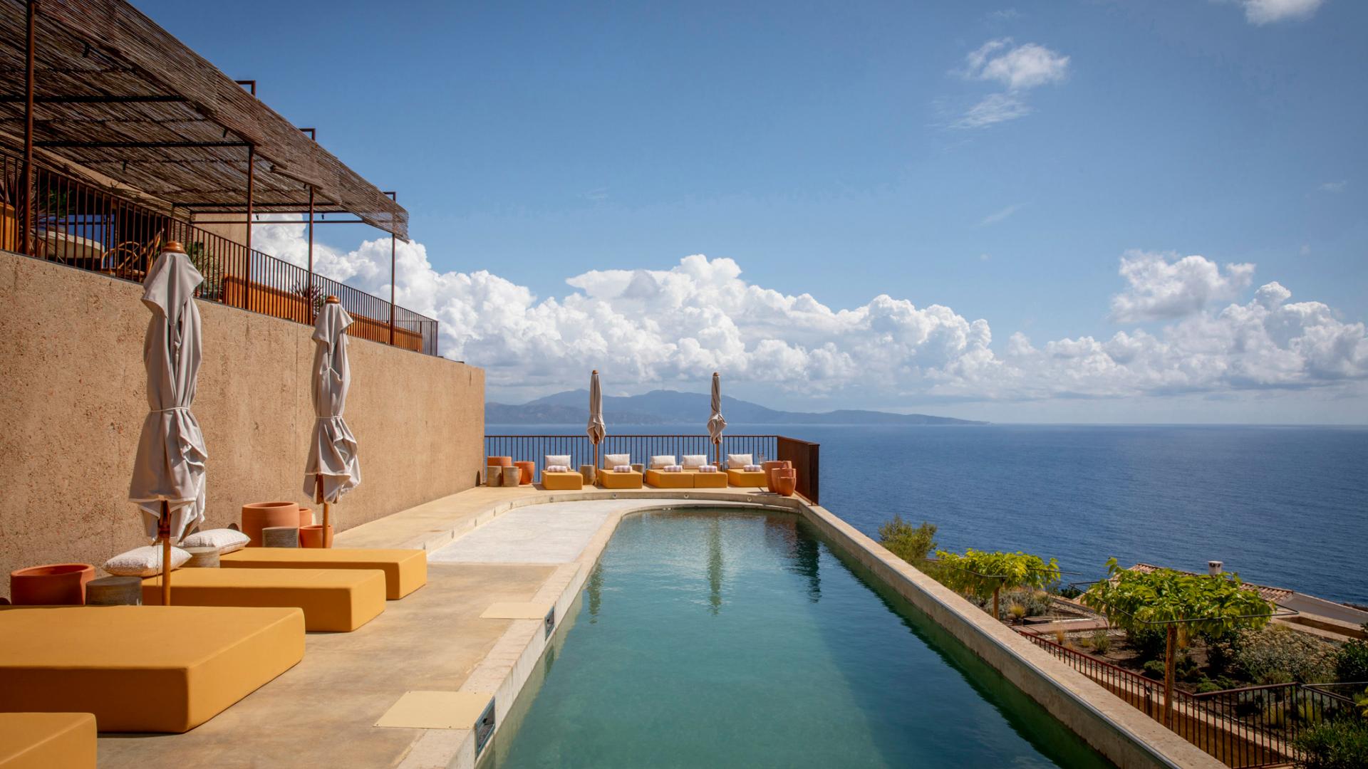 Conçu par le cabinet Orma Architettura et pensé dans le respect du relief, le lieu mêle pierre, béton brut et végétation endémique pour dialoguer avec la nature environnante. La décoratrice Dorothée Meilichzon y insuffle un univers minéral et organique, inspiré à la fois du maquis et de la mythologie méditerranéenne.